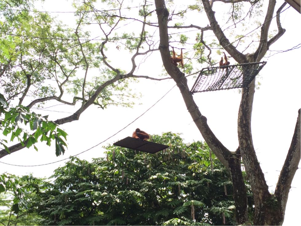 オランウータンが高い木の上で遊んでいます。
