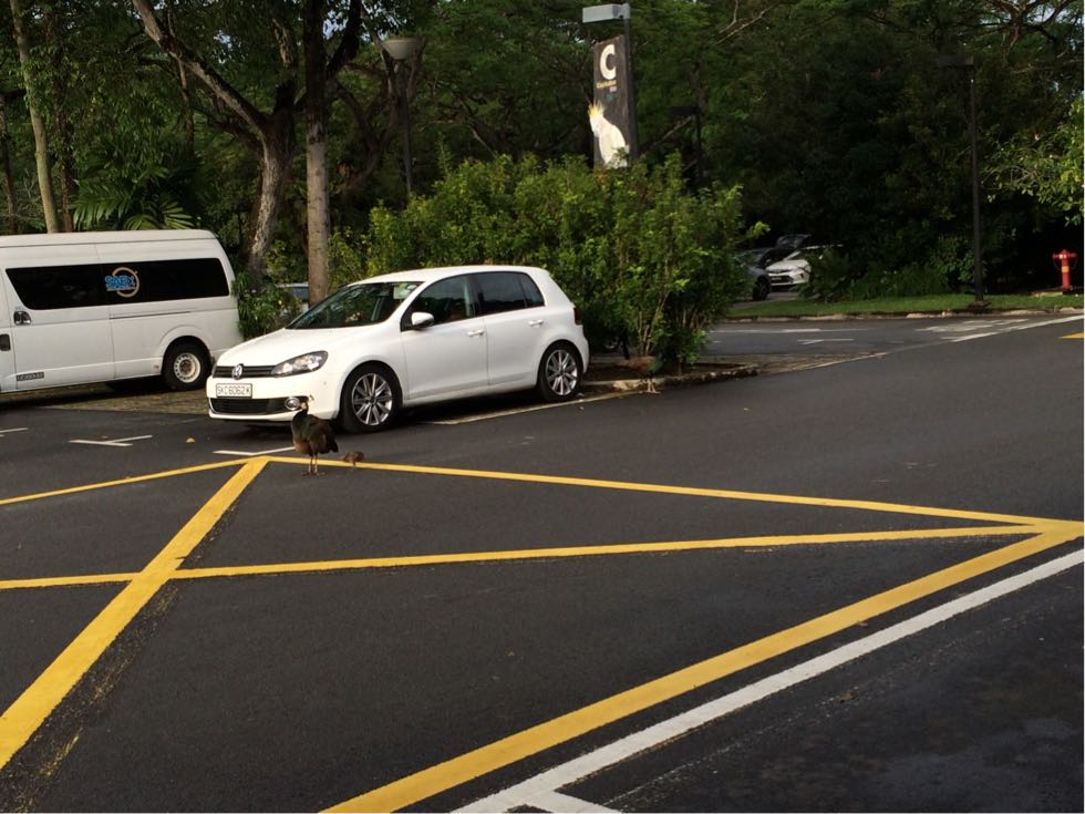 帰りのタクシー乗り場前の駐車場に、ひょっこりと野生のクジャクの親子が現れました。