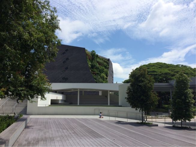 博物館の建物の角に赤い土と木々が生えている!