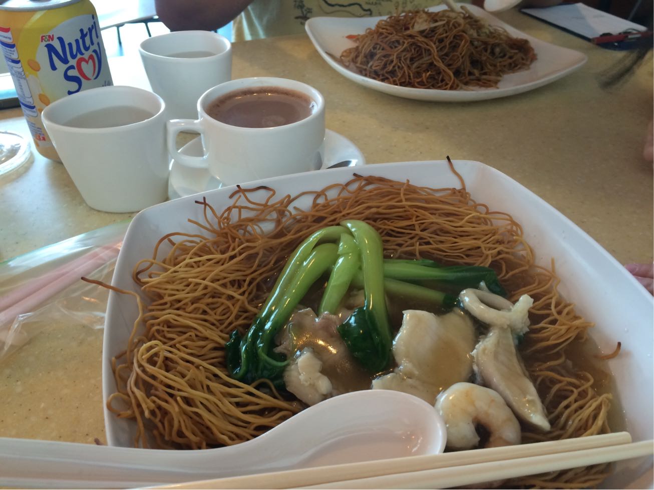 揚げ麺のシーフードあんと、香港式炒麺。